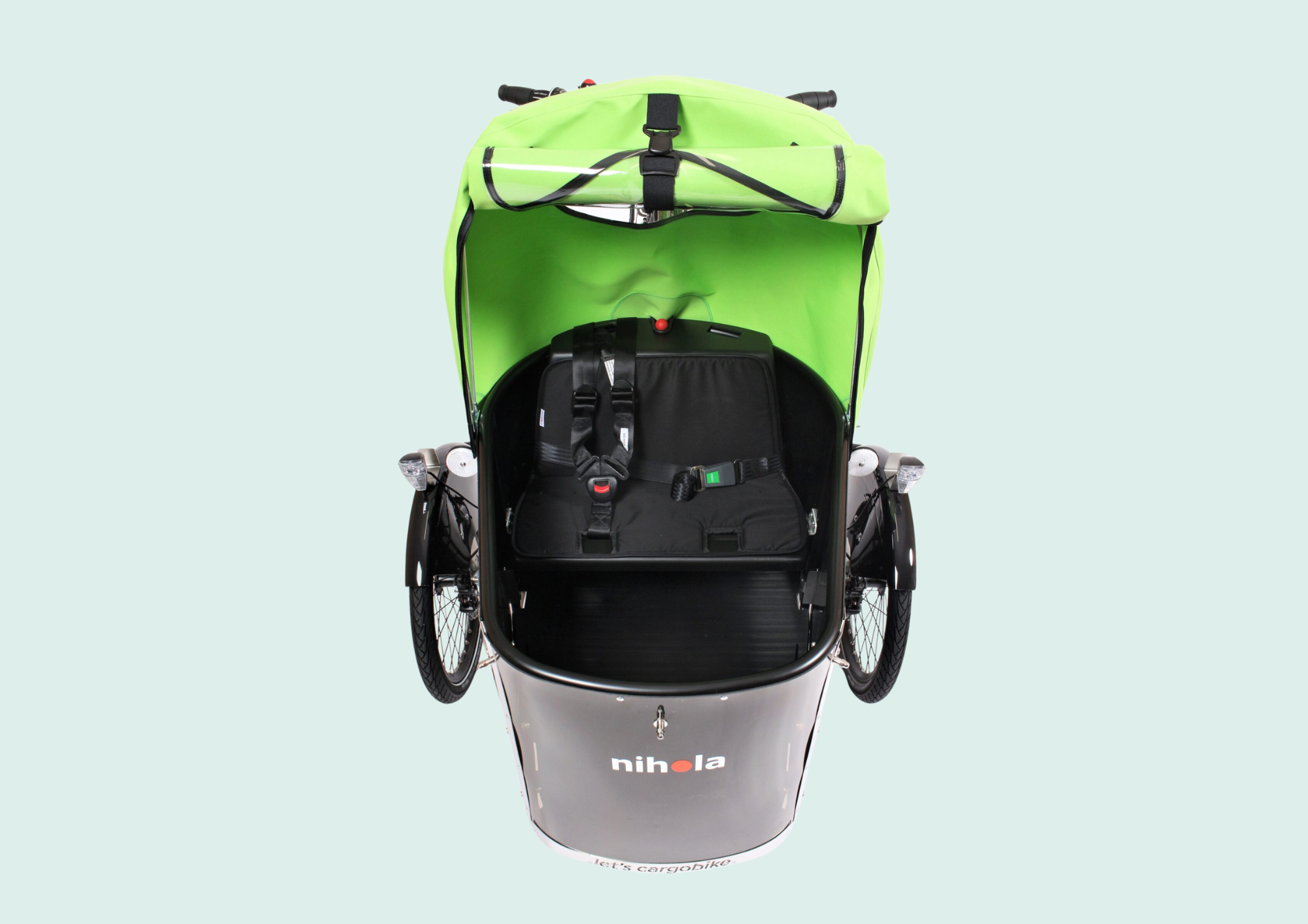 The Nihola Family is a practical cargo bike designed for safe and versatile everyday family transport. It has a spacious cabin, that can seat two children on the bench. This bench can be easily removed without tools, making room for cargo.
